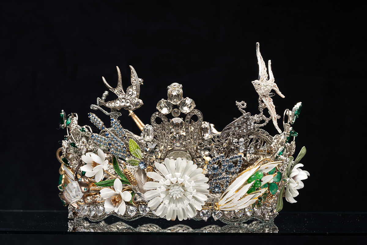 Mindy Lam (United States, born China), Transcendent Beauty (detail), 2020-2026, 14k gold-filled wire, copper wire, brass wire, crystal, rhinestone, found porcelain bowl fragment, pearls, 38ct green amethyst, emerald, green tourmaline, vintage elements, Taubman Museum of Art, acquired with funds Ppovided by Joanne Leonhardt Cassullo and The Dorothea L. Leonhardt Foundation, Inc. in Honor of the Museum’s 75th Anniversary, 2026.009a Transcendent Beauty Headdress (detail), 2026 14k gold-filled wire, vintage rhinestones, Swarovski pearls, pheasant feathers, Taubman Museum of Art, gift of the artist in honor of the Museum’s 75th Anniversary, 2026.009b