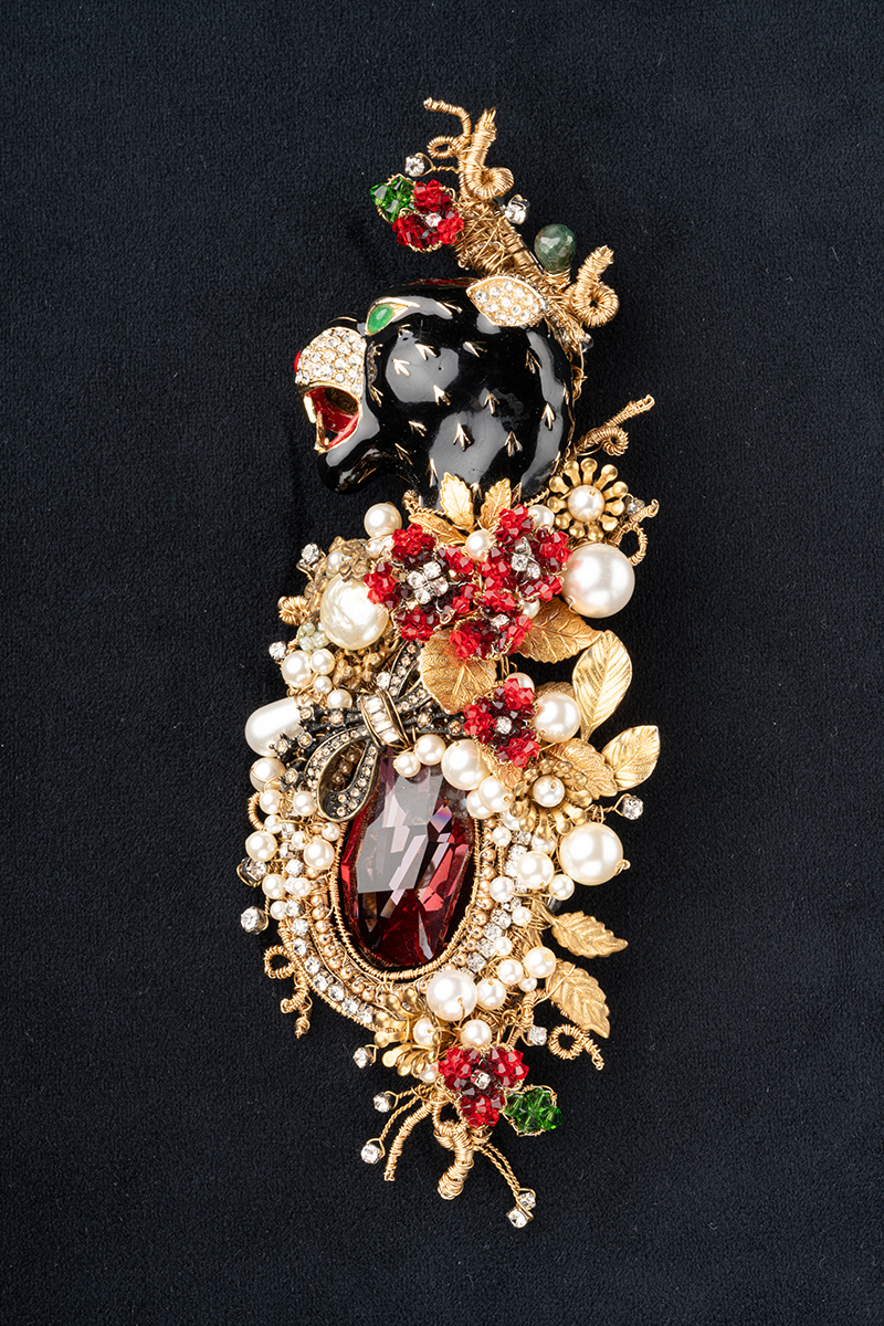 Mindy Lam (United States, born China), Pounce of the Jaguar Brooch, 2024, 14k gold-filled wire, crystal, rhinestone, pearl, emerald, vintage elements, private collection, Austin, Texas
