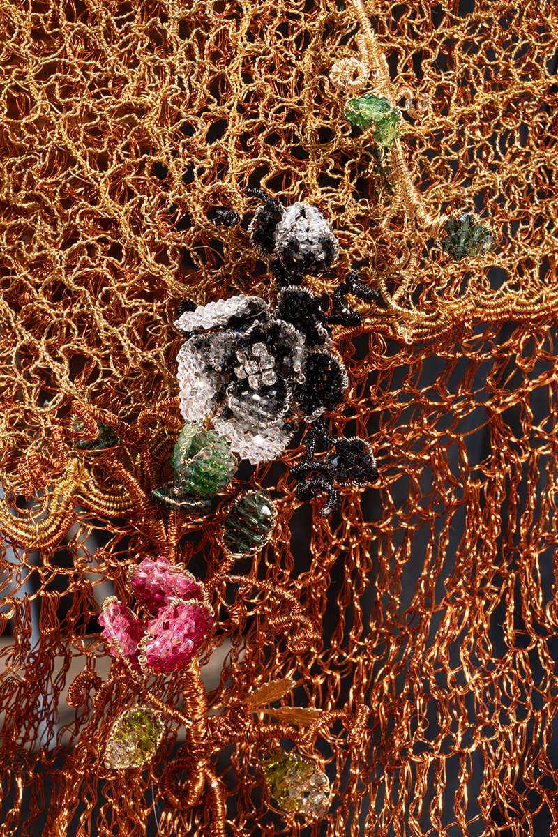 Mindy Lam (United States, born China), Transcendent Beauty (detail), 2020-2026, 14k gold-filled wire, copper wire, brass wire, crystal, rhinestone, found porcelain bowl fragment, pearls, 38ct green amethyst, emerald, green tourmaline, vintage elements, Taubman Museum of Art, acquired with funds Ppovided by Joanne Leonhardt Cassullo and The Dorothea L. Leonhardt Foundation, Inc. in Honor of the Museum’s 75th Anniversary, 2026.009a