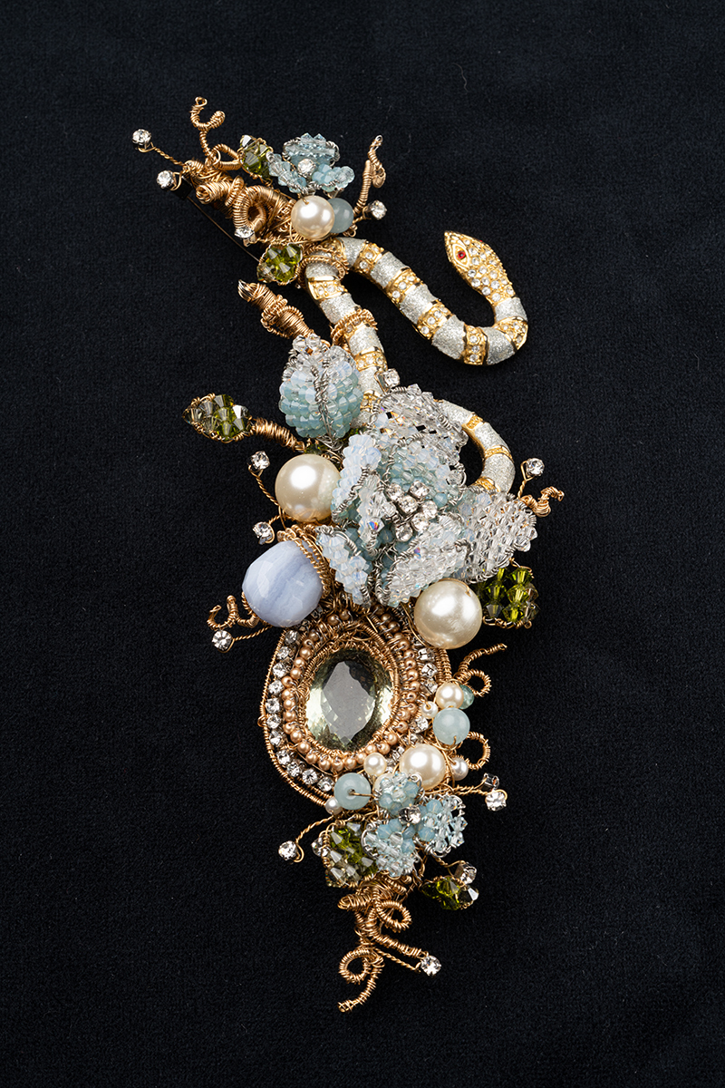 Mindy Lam (United States, born China), Wonder of the Striped Serpent Brooch, 2024, 14k gold-filled wire, crystal, rhinestone, pearl, aquamarine, blue lace agate, 28ct green amethyst, vintage elements, private collection, Washington, DC