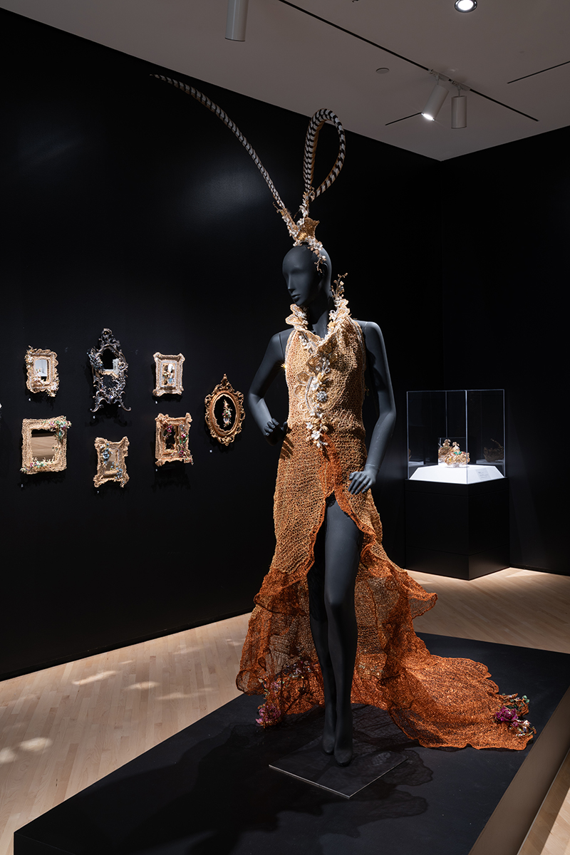 Gallery installation view of Mindy Lam’s Transcendent Beauty gown and headdress with frames in the background