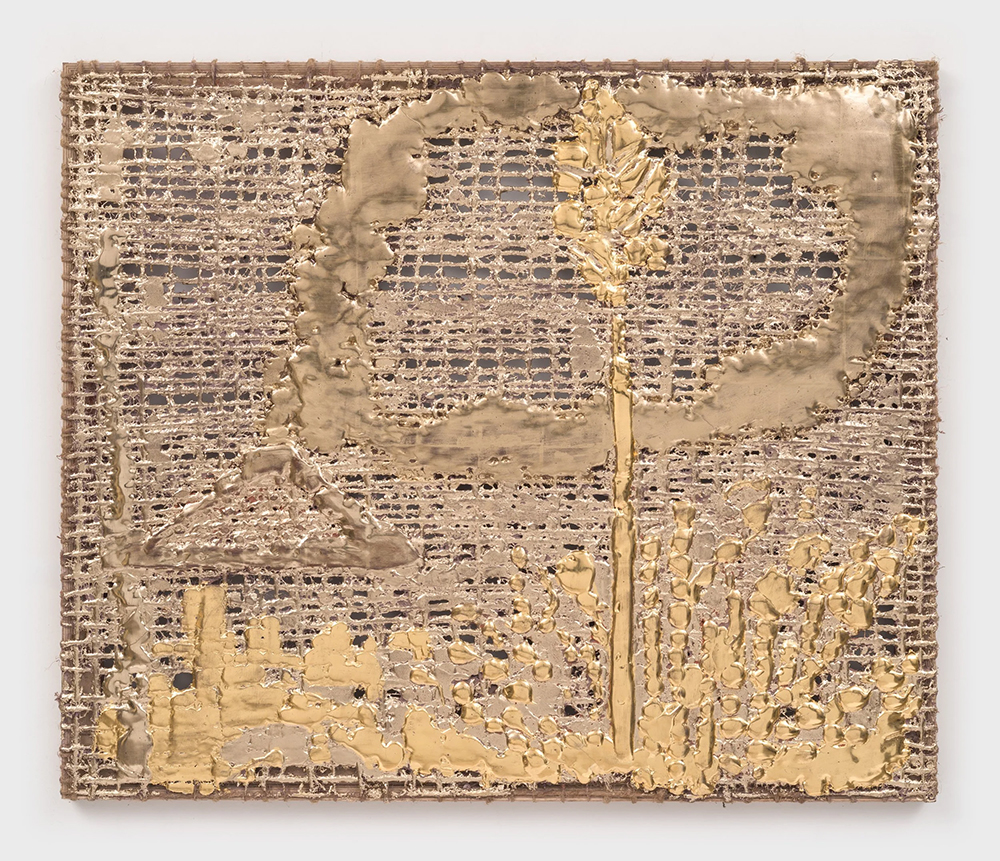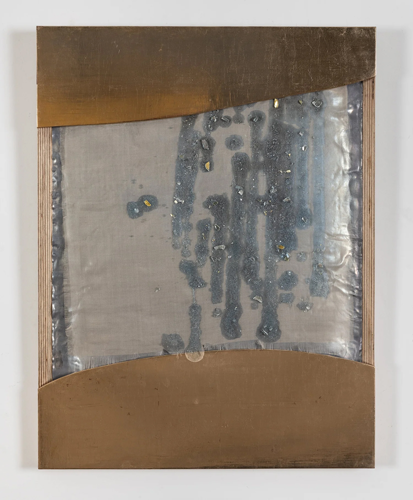 The light veil of Shadow Element (2024) undulates with the movement of air in the painting’s environment. Another new facet is a nocturnal radiance never before present in her work: fluorescence. There is chemistry at work in this piece: drippings of Oxygen, Silicon, Argon, Tungsten, and Silver propelled onto the veil interact endlessly with a sheet of lead behind them. This work in progress will modify the painting’s appearance for some time, giving shape to what the artist calls “ghosts.”